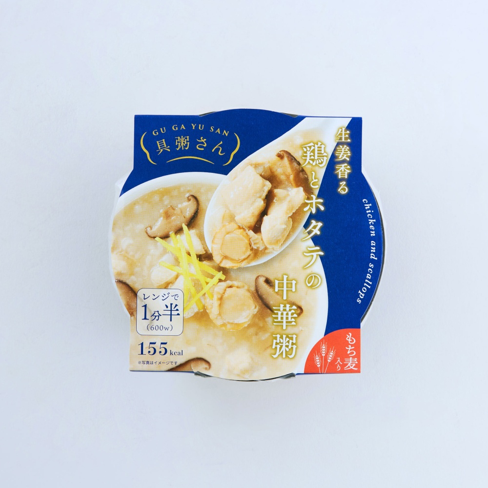 鶏肉(タイ産)、精米(国産)、ほたて貝、チキンスープ、椎茸水煮、生姜、もち麦、食用ごま油、チキンエキス調味料、焼酎、オイスターソース、食塩、胡椒/増粘剤(加工でん粉)、調味料(アミノ酸等)、酸化防止剤(ビタミンE)、カラメル色素、(一部にごま・鶏肉を含む)